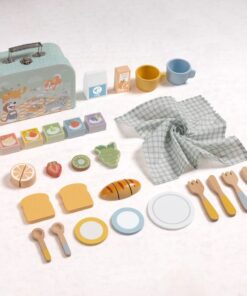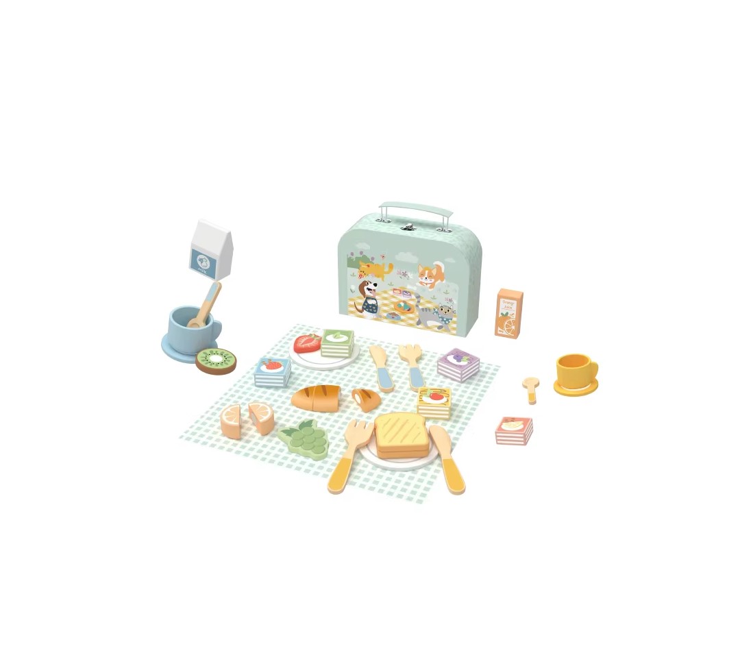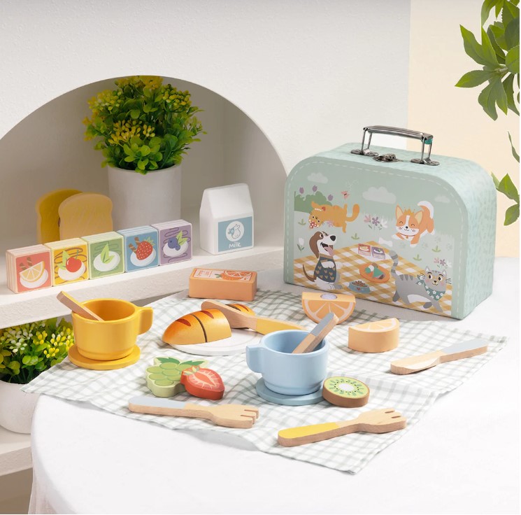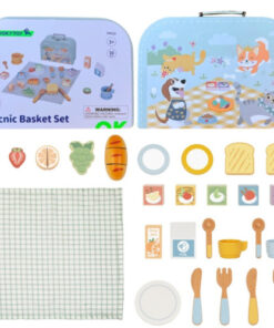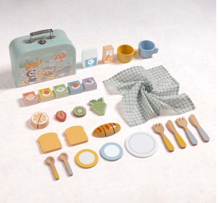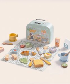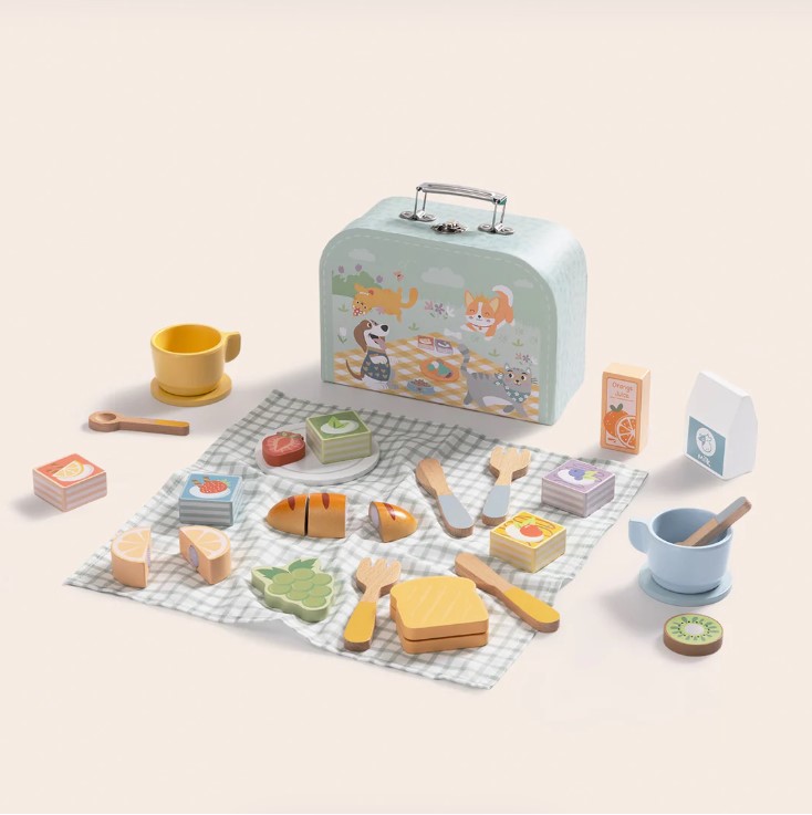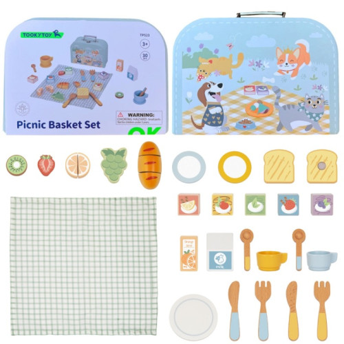 Είστε έτοιμοι για ένα όμορφο πικνίκ στο δάσος; Ένα χαριτωμένο βαλιτσάκι με όλα τα απαραίτητα τρόφιμα για ένα αξέχαστο πικνίκ. Το σετ περιλαμβάνει ένα καρό τραπεζομάντηλο, ξύλινα φρούτα, ποτηράκια, πιατάκια, μαχαιροπίρουνα και γλυκά. Όλα είναι τακτοποιημένα σε ένα χάρτινο βαλιτσάκι, για εύκολη αποθήκευση και μεταφορά. Με αυτό το σετ το παιδί αναπτύσσει τις κινητικές του δεξιότητες, την κοινωνικότητά του και τη φαντασία.