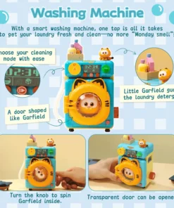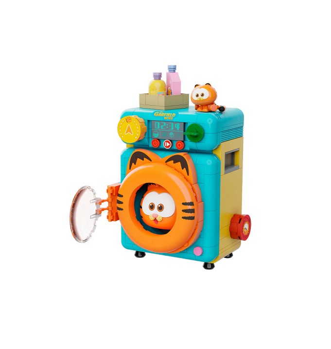 Με ένα έξυπνο πλυντήριο ρούχων, από τουβλάκια, αρκεί ένα άγγιγμα για να έχετε τα ρούχα σας φρέσκα και καθαρά! Γυρίστε το κουμπί για να περιστρέψετε τον Γκάρφιλντ μέσα. Η διαφανής πόρτα ανοίγει.