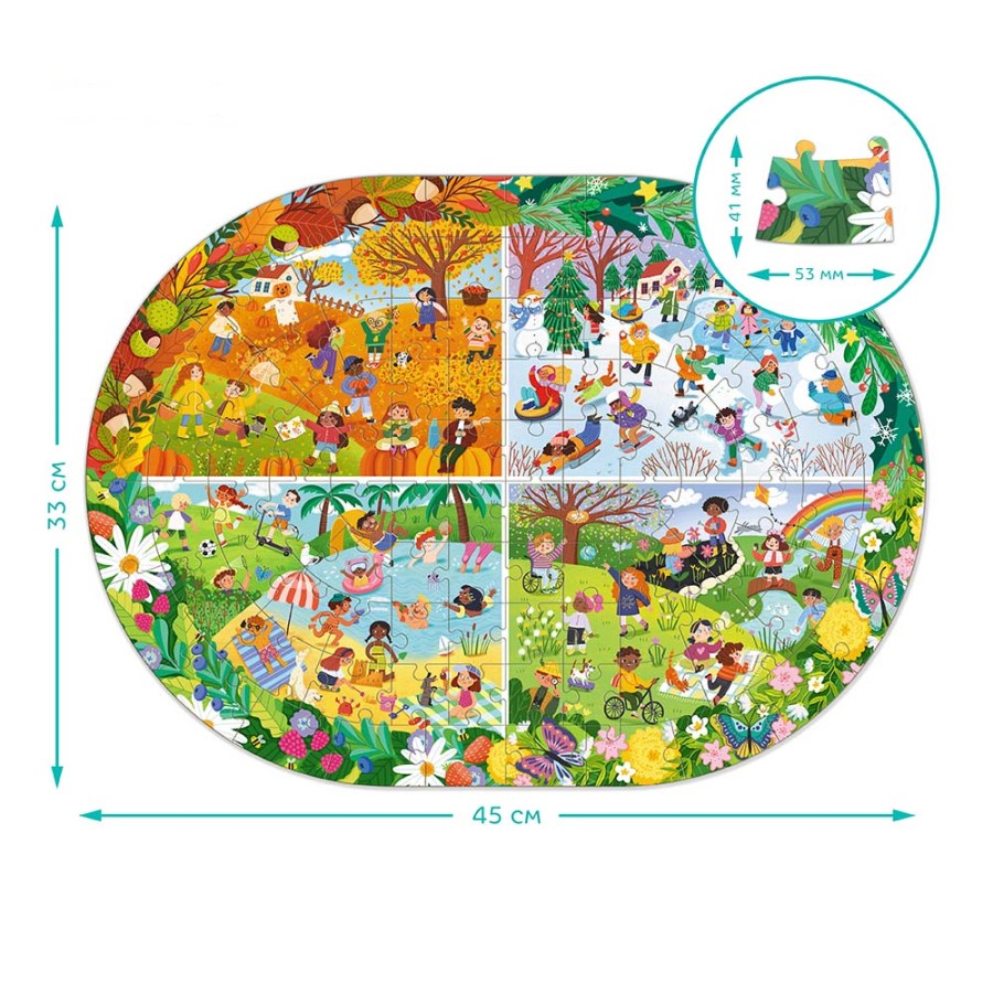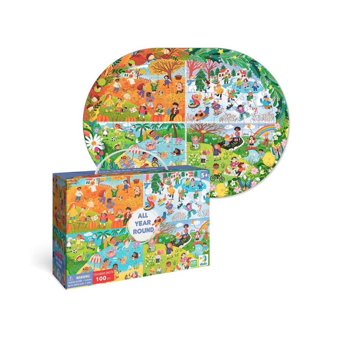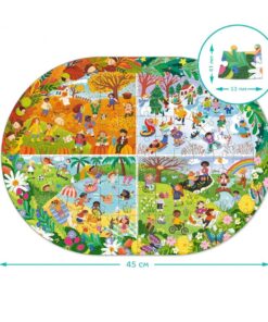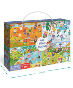 Το παζλ « Όλο το Χρόνο » είναι ένα συναρπαστικό παζλ 100 Artikel, που δημιουργήθηκε για παιδιά ηλικίας 5 Jahre und älter. Κατά τη συναρμολόγηση το παιδί θα ανακαλύψει μια εικόνα τω 4 εποχών – από τη χειμερινή διασκέδαση μέχρι τις καλοκαιρινές περιπέτειες. Αυτό το παζλ δεν είναι μόνο διασκεδαστικό αλλά προάγει και την ανάπτυξη των λεπτών κινητικών δεξιοτήτων, της προσοχής, της μνήμης, της οπτικής αντίληψης και της φαντασίας. Χάρη στη φωτεινή εικόνα του, το παιδί θα θυμάται εύκολα τις εποχιακές αλλαγές στη φύση και θα μάθει να διακρίνει τα χαρακτηριστικά κάθε εποχής.