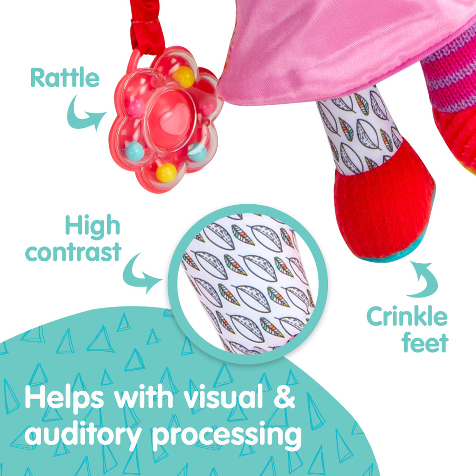 Η Ολίβια είναι η τέλεια πρώτη κούκλα για το μωρό! Έχει μαλακό σώμα και είναι φτιαγμένη από υφάσματα με διαφορετικές υφές για εξερεύνηση, ένα αξιολάτρευτο κεντημένο πρόσωπο και κρατάει ένα λουλούδι κουδουνίστρα στο χέρι της. Η Ολίβια σας βοηθάει να καθοδηγήσετε το μωρό σας σε σημαντικά πρώτα στάδια ανάπτυξης. Τα φωτεινά χρώματα και τα αντίθετα μοτίβα διεγείρουν την οπτική ανάπτυξη του μωρού ενώ οι διαφορετικές υφές βοηθούν στη βελτίωση των λεπτών κινητικών δεξιοτήτων και στην αίσθηση της αφής.