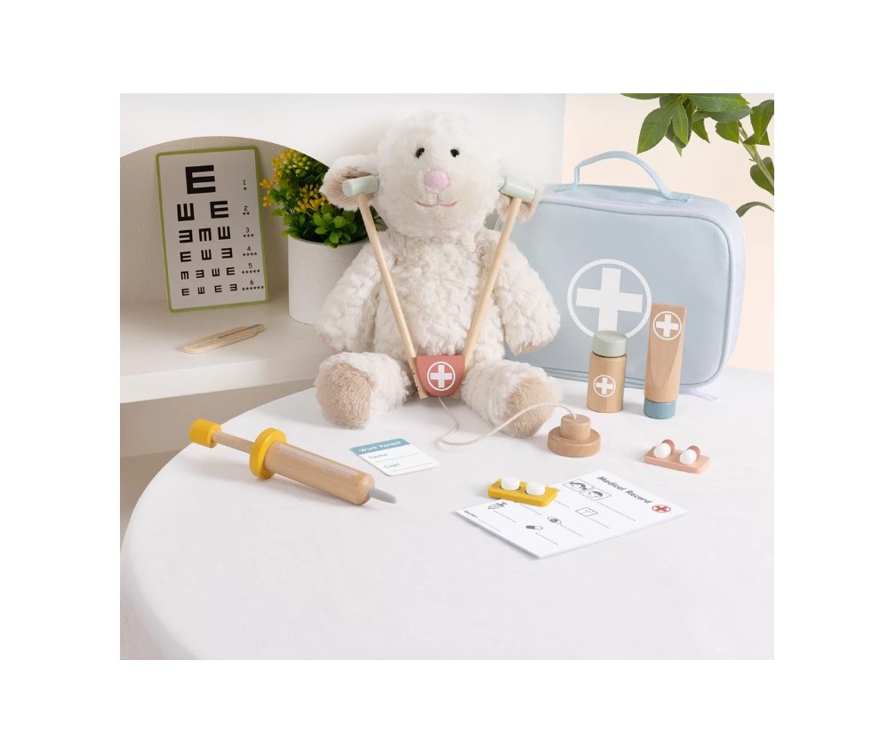 Γίνε ο πιο γλυκός μικρός γιατρός! Το σετ γιατρού έχει όμορφα παστέλ χρώματα και ωραίο σχεδιασμό. Διαθέτει όλα τα απαραίτητα εργαλεία γιατρού, που αποθηκεύονται σε ένα υφασμάτινο βαλιτσάκι, για να μπορούν τα παιδιά να το μεταφέρουν μαζί τους. Το βαλιτσάκι περιλαμβάνει στηθοσκόπιο, σύριγγα, χαπάκια, μπουκάλια με φάρμακο και θερμόμετρο. Με το παιχνίδι αυτό τα παιδιά αναπτύσσουν τη φαντασία και την κοινωνικότητά τους με τον πιο διασκεδαστικό τρόπο.