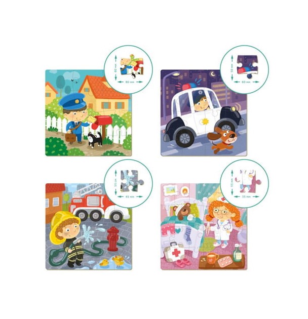 4 rompecabezas que tienen respectivamente 12, 16, 20, 24 pistas sobre el tema de las profesiones. Un juego de rompecabezas que ofrece 4 niveles de dificultad, para que el juego se vuelva más difícil. Es adecuado para niños mayores de edad. 3 años y mayores y les ayuda a desarrollar habilidades motoras finas, coordinación y pensamiento espacial.
