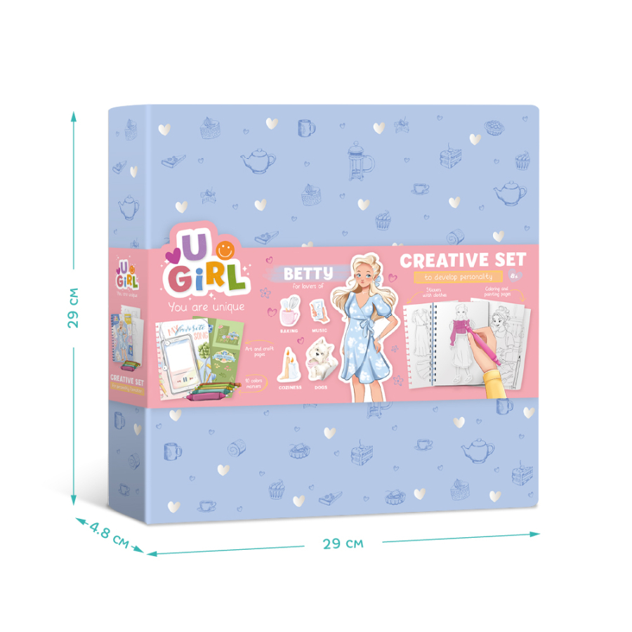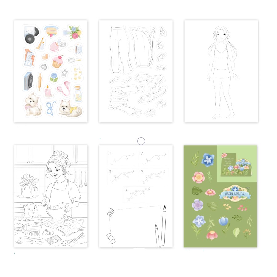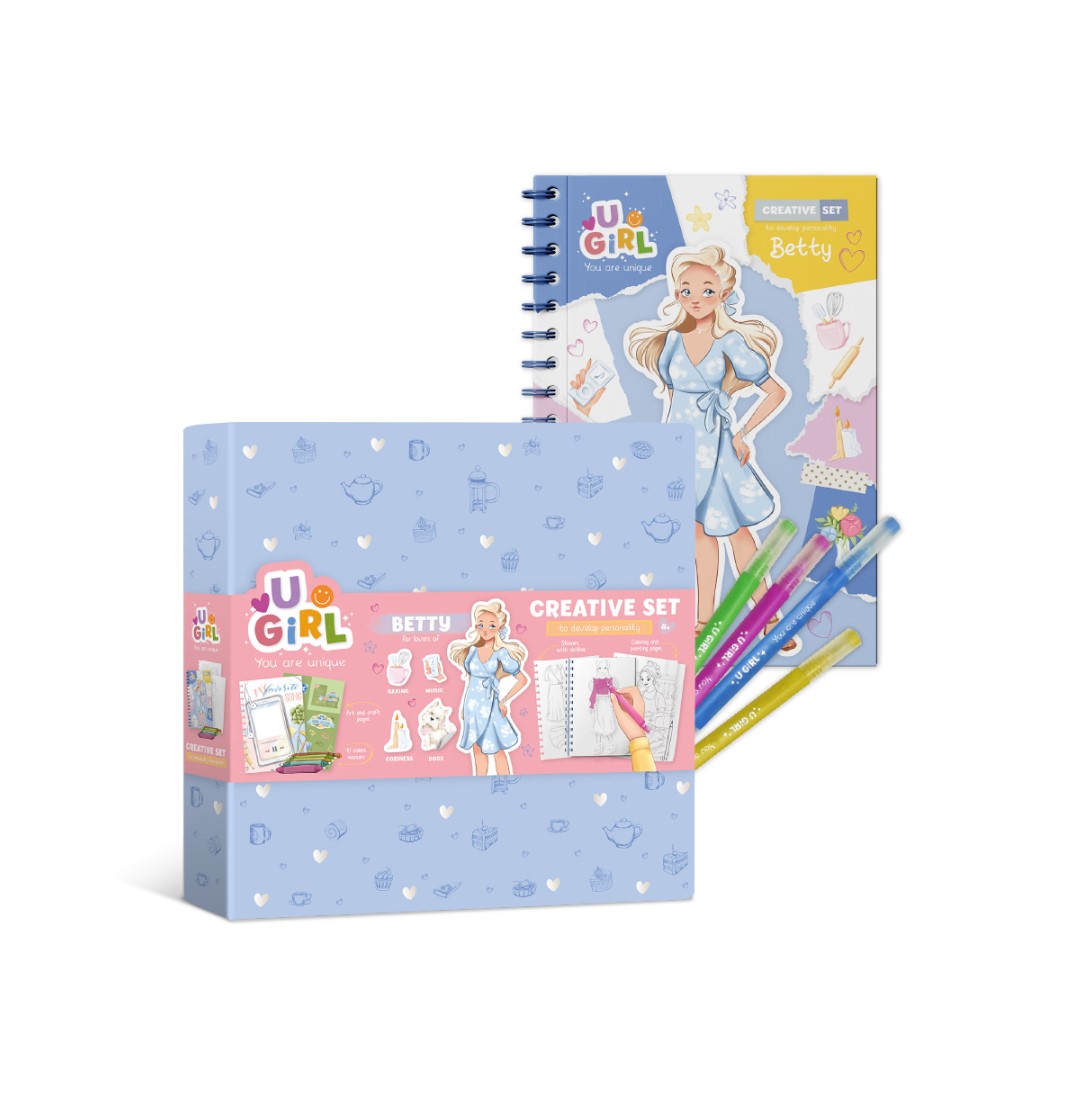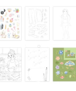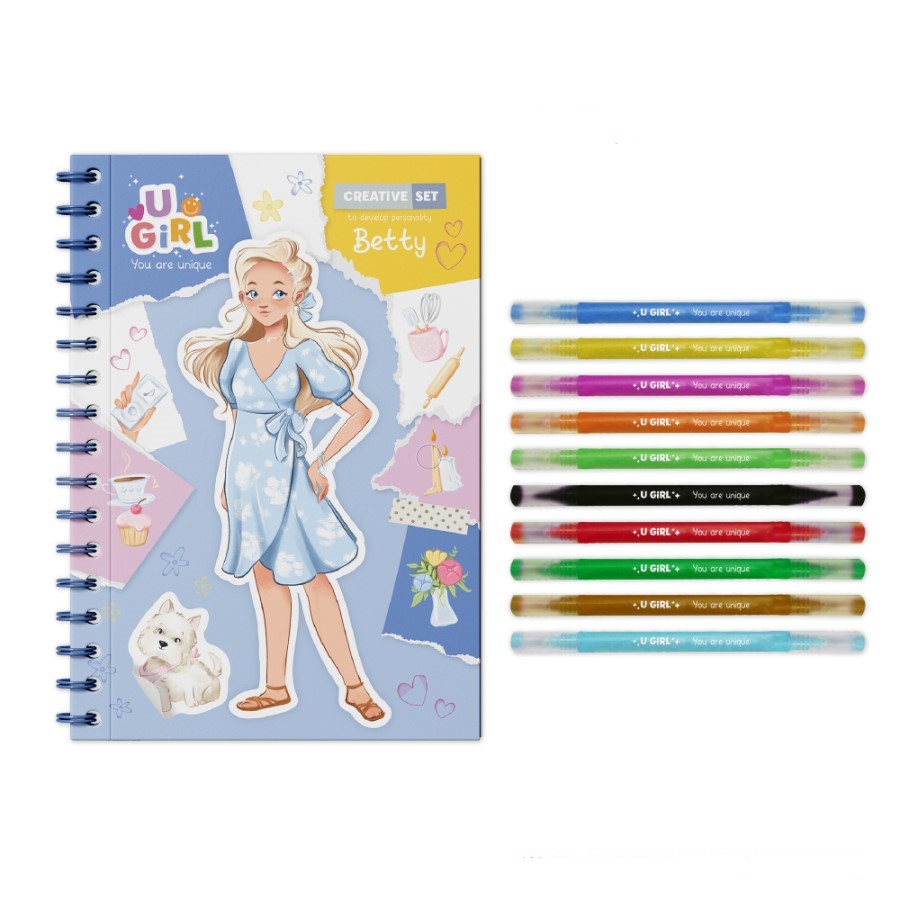 Содержимое: μπλοκ με εικόνες ( 25 Икс 17,6 см ), 10 μαρκαδόροι, αυτοκόλλητα και 6 σελίδες χρωματισμού με αυτοκόλλητα, 15 φιγούρες κοριτσιών για τη δημιουργία εικόνων, 4 σελίδες χρωματισμού, 3 σελίδες με σχέδιο βήμα προς βήμα, 4 σελίδες με χειροτεχνίες.