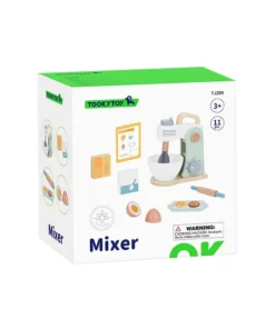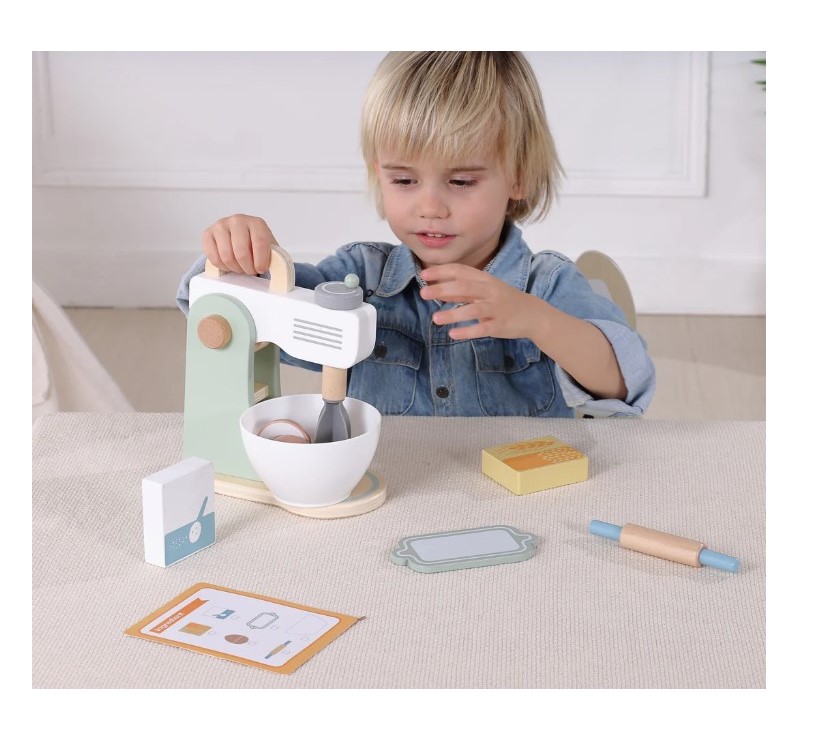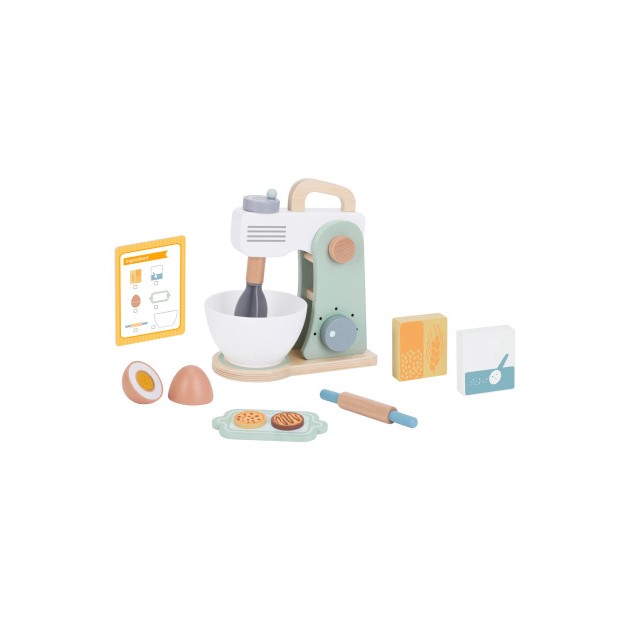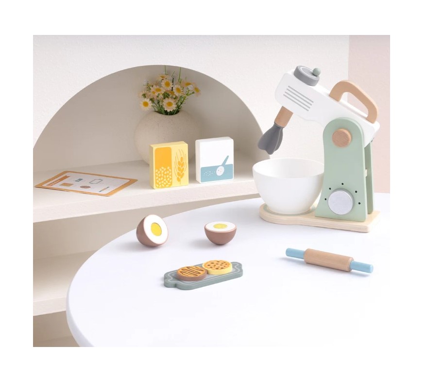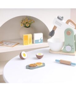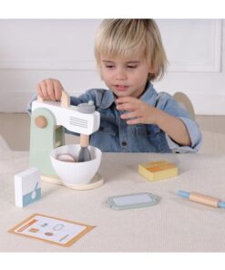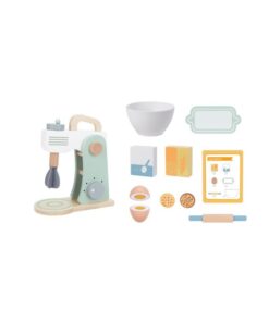 Ζήστε τη χαρά του ψησίματος με αυτό το ξύλινο σετ μίξερ, όπου η δημιουργικότητα συναντά τη γαστρονομική απόλαυση. Στο μίξερ υπάρχει μια λαβή που περιστρέφει τον αναδευτήρα, ακριβώς όπως ένα πραγματικό μίξερ. Παρακολουθήστε το παιδί σας να προσθέτει υλικά, αλεύρι και ζάχαρη, να σπάει το ξύλινο αυγό, που διαθέτει αυτοκόλλητο velcro, και να ανοίγει ζύμη με τον πλάστη που περιλαμβάνεται. Με τη συνταγή που υπάρχει στην κάρτα, οι επίδοξοι μάγειρες μπορούν να δημιουργήσουν το δικό τους γλυκό. Ενθαρρύνετε το μικρό σεφ να εξερευνήσει τον κόσμο του ψησίματος με αυτό το απολαυστικό παιχνίδι.