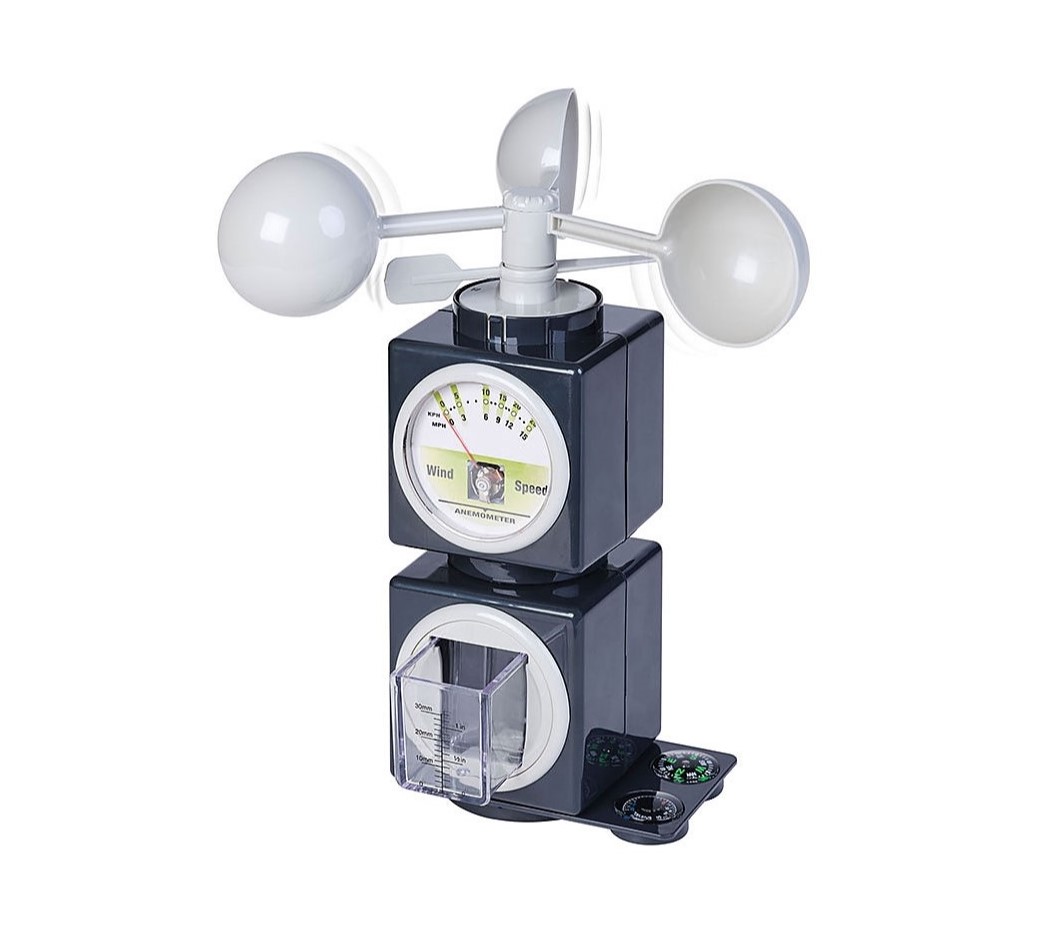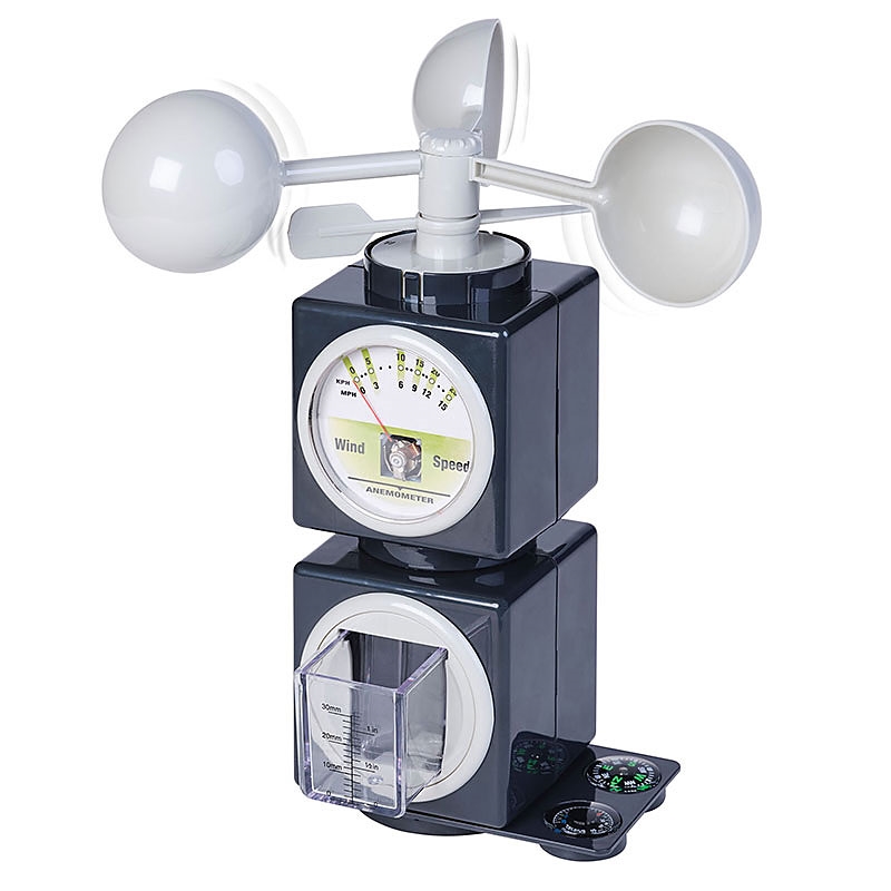 - Ένα ανεμόμετρο που περιστρέφεται για να μετρήσει την ταχύτητα του ανέμου σε μίλια ή χιλιόμετρα ανά ώρα. Ένας δείκτης δείχνει από που προέρχεται ο άνεμος και με την ενσωματωμένη πυξίδα, να καταγράφετε την κατεύθυνση του ανέμου.