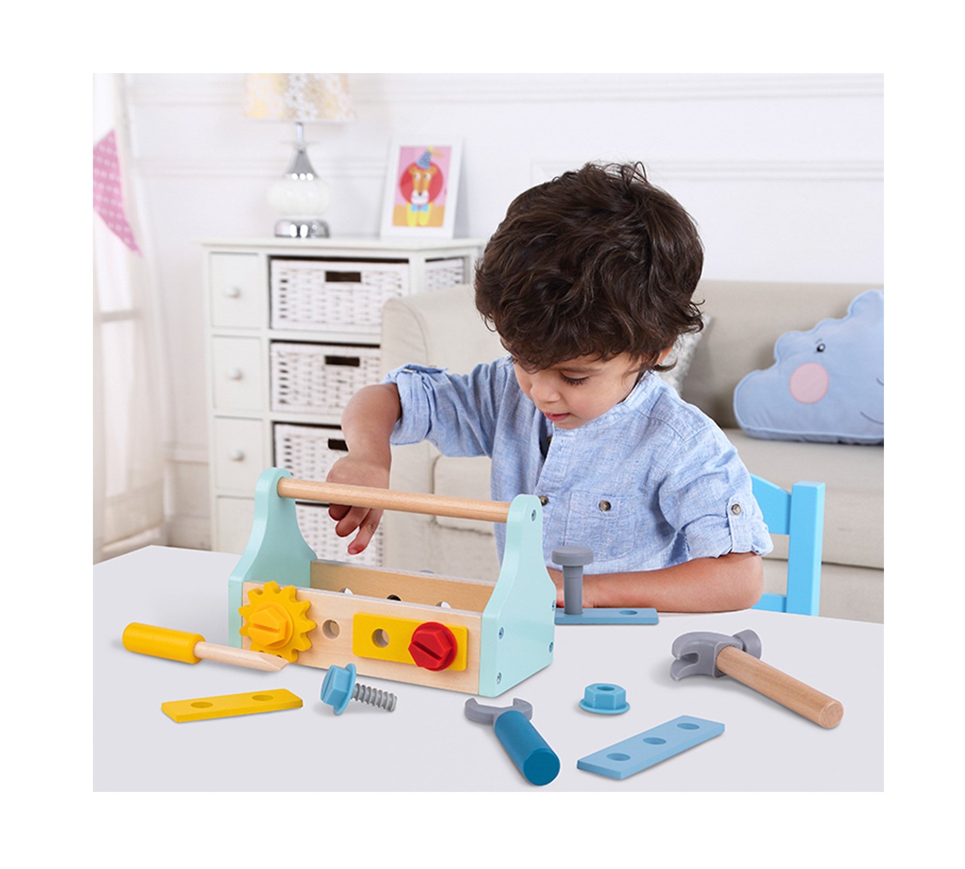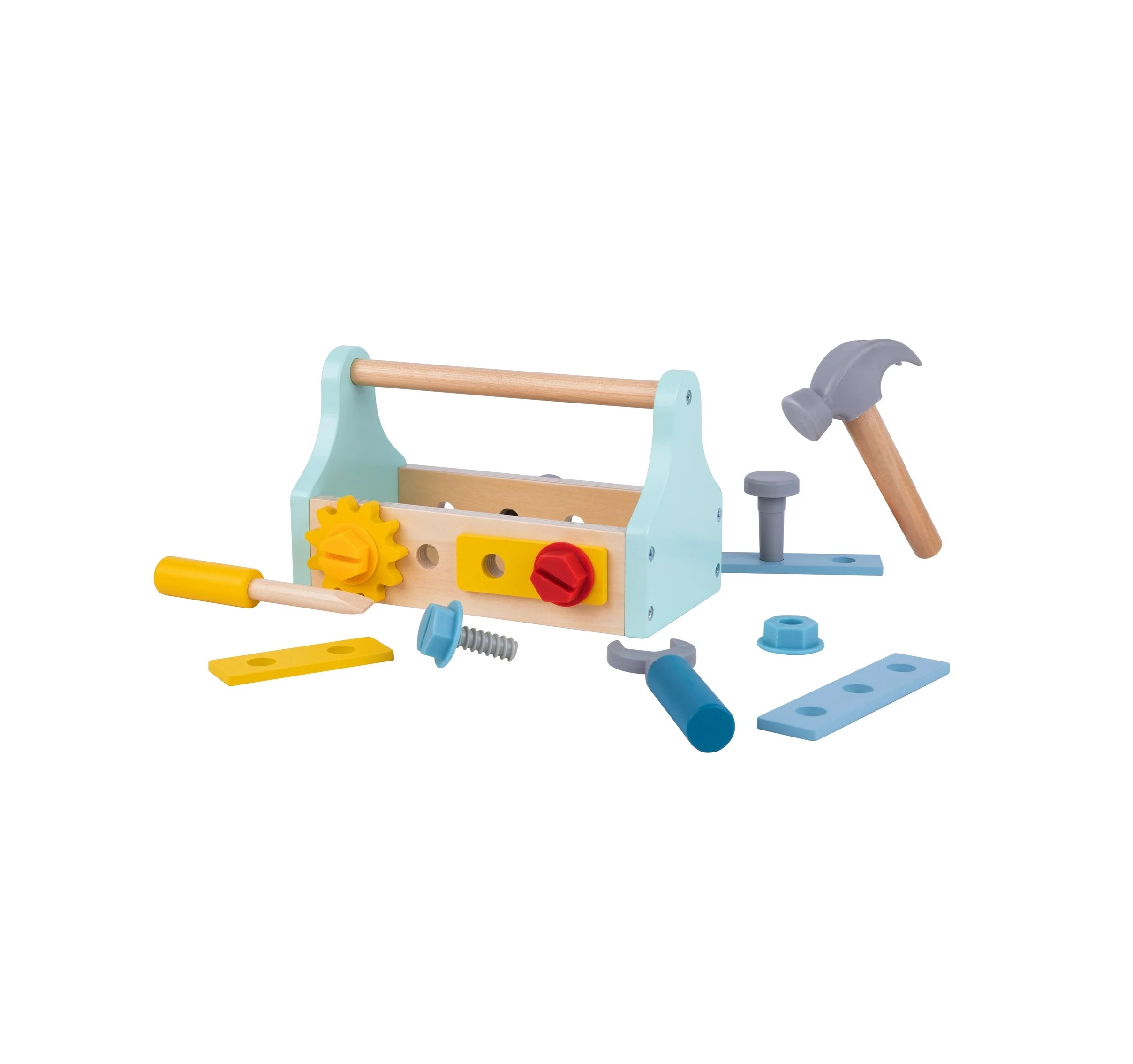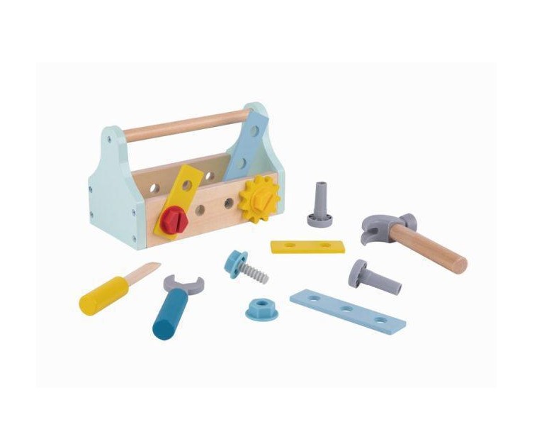 Το ξύλινο κουτί με τα εργαλεία είναι ένα φανταστικό σετ εργαλείων για τους μικρούς μάστορες. Περιλαμβάνει κατσαβίδι, σφυρί, βίδες, παξιμάδια, όλα τακτοποιημένα στην ξύλινη εργαλειοθήκη. Η λαβή μεταφοράς βοηθάει το παιδί να μεταφέρει τα εργαλεία του παντού. Με το σετ αυτό τα παιδιά αναπτύσσουν λεπτές κινητικές δεξιότητες και το συντονισμό ματιού – χεριού.